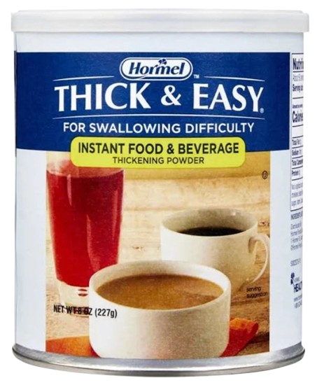 Easier, more appealing, and safer for swallowing - Three easy reasons why Hormel Health Labs' THICK & EASY Food & Beverage Thickeners are the products of choice used by thousands of healthcare facilities for their swallowing impaired patients. Our thickeners are so versatile that it is now possible to thicken all types of hot & cold foods, liquids and supplement drinks without affecting the taste. Simply add our specially formulated thickeners to your desired food or liquid, and almost instantly, they become the proper consistency for safe swallowing. Patients with dysphagia can enjoy tasty, nourishing foods, while maintaining a properly hydrated and healthy nutritional status.